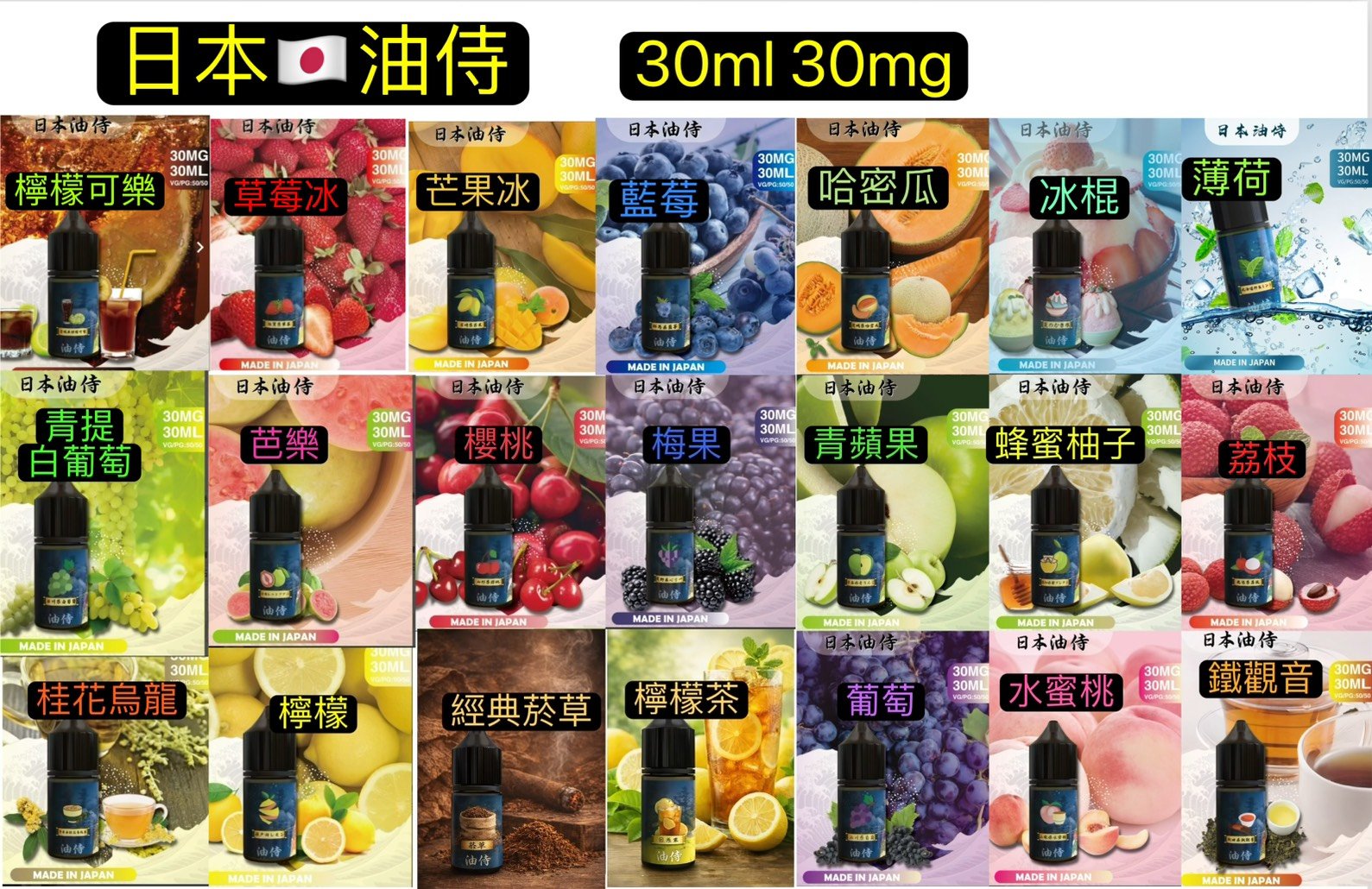 | 日本油恃30CC 30MF | 檸檬可樂, 草莓冰, 芒果, 藍莓, 哈密瓜, 冰棍, 薄荷, 清提白葡萄, 芭樂, 櫻桃, 莓果, 青蘋果, 蜂蜜柚子, 荔枝, 桂花烏龍, 檸檬, 經典X草, 凍檸檬茶, 葡萄, 水蜜桃, 鐵觀音, 批發 |